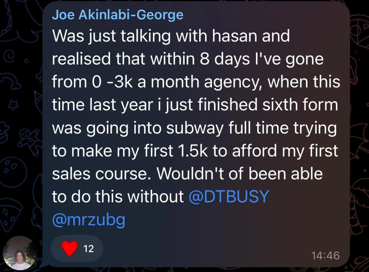 After a few months of being inside the group he took the decision to go all in on his Agency. Fast forward to today where he consistently makes £12,000 a month.